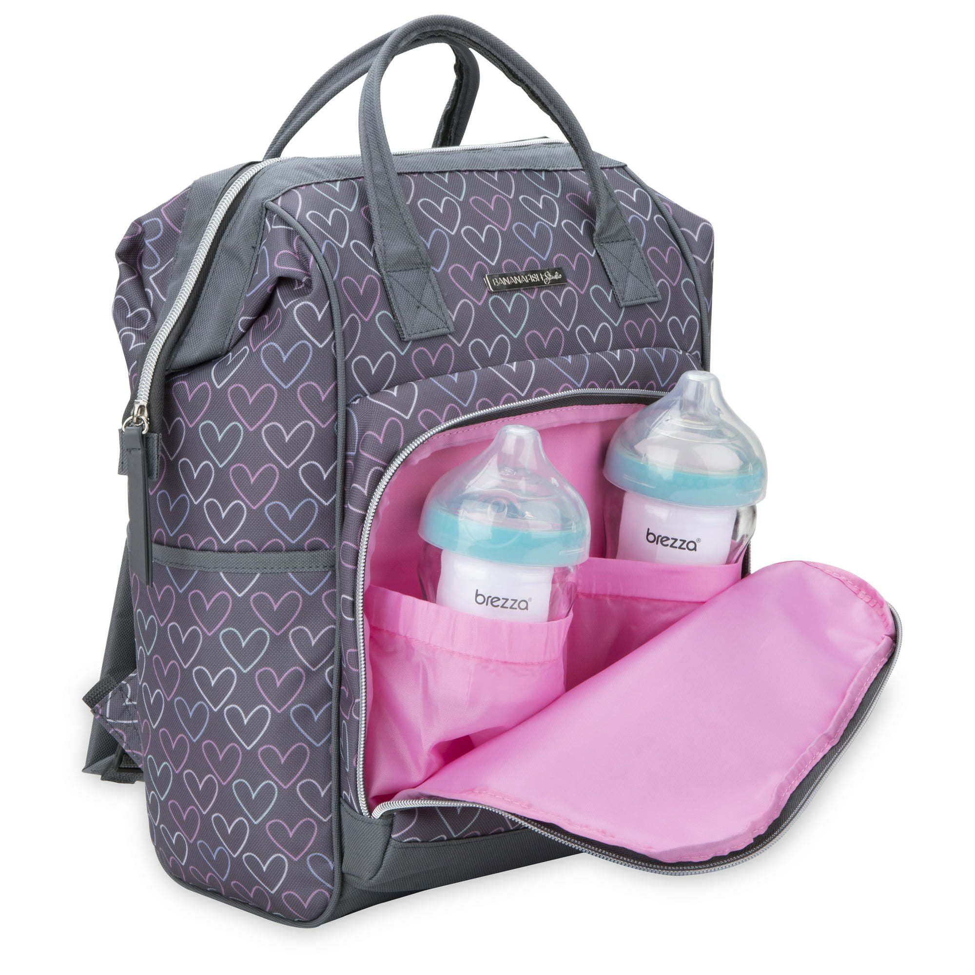 • Fashionable mini backpack with 8 elastic and zippered pockets to store your baby care essentials and personal belongings • Hybrid style can be worn 3 ways. Wear it on your back to distribute weight evenly with adjustable padded straps, carry it with your hand by the soft top carry handles or attach to stroller with stroller loops for easy travel convenience • Spacious main compartment and front zippered compartment with 2 interior bottle pockets keep you organized • Structured frame opens wide for easy access to interior • Removable fold up changing pad makes changes on the go a breeze