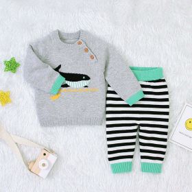Baby Boy Cartoon Animal Embroidered Pattern Shoulder Button Design Pullover Sweater & Striped Trousers Sets (Color: Grey, Size/Age: 100 (2-3Y))