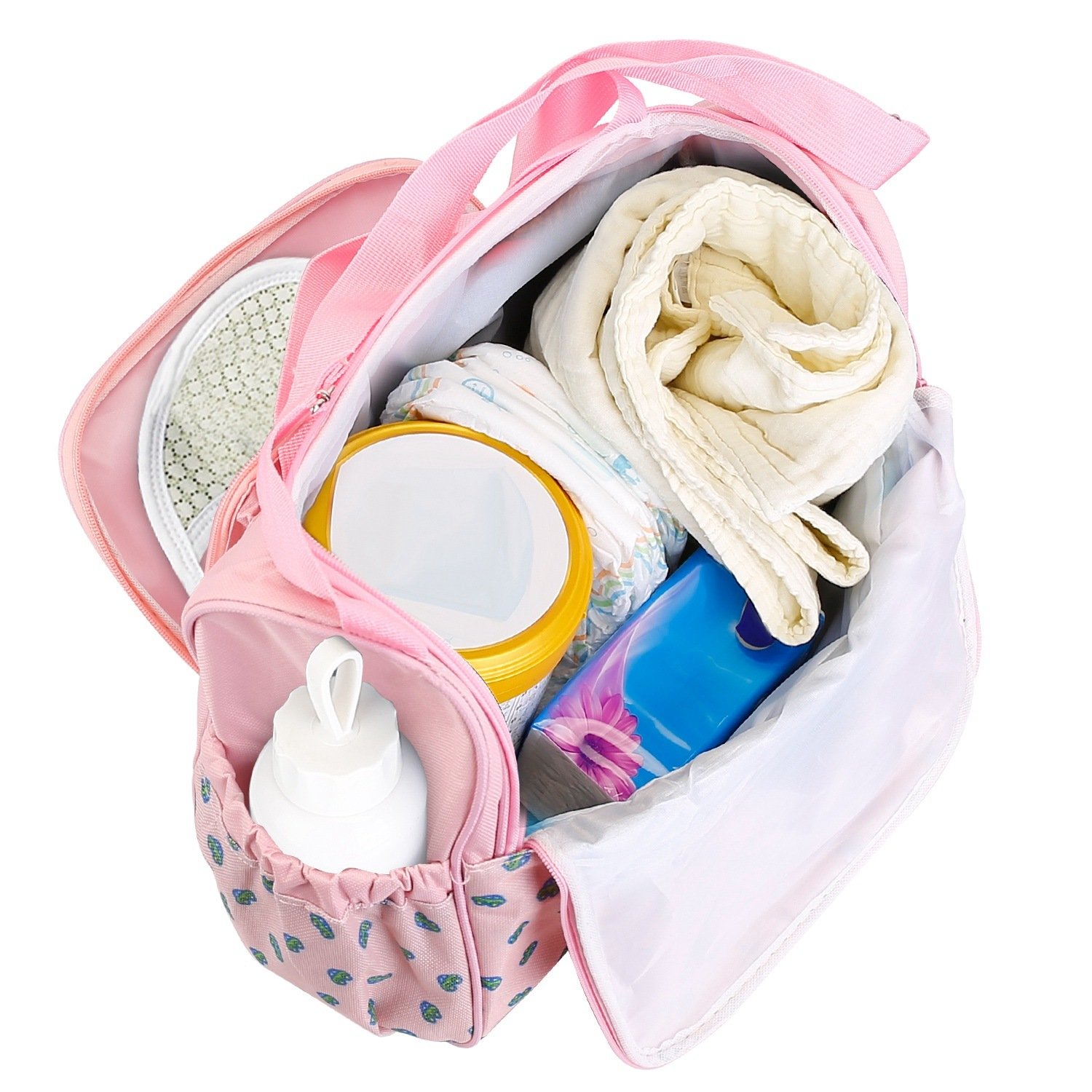 *Multifunctional Bag Set*:3 Bags with a diaper mat to hold different baby essentials. Large bag with a front zipper bag; a back fastener pocket; 2 small side pockets and a main compartment; to hold baby clothes; diapers; tissues; toys and hats;Medium bag with a front fastener pocket and 2 side net pockets to hold baby food and snacks;Bottle bag to hold the milk bottle;Nappy pad brings much convenience for changing diaper.